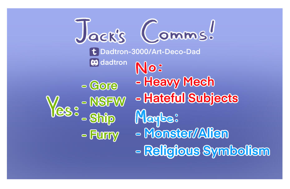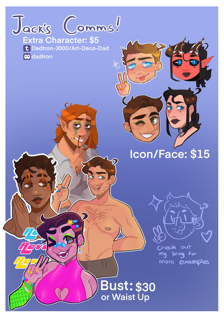 • Ship artI have the right to refuse any request if I do not feel comfortable with it.I usually take at least a couple of days depending on image, sketch is usually done in a few hours.Paypal: Will not refund on full art completion, which is why I send a sketch and clean sketch first before a fully rendered piece to see if changes need to be made, a partial view or watermarked render will be sent before payment. After payment the full render will be sent. This changes if the commission is a sketch/line-art, a rough sketch will be sent to see if any changes want to be made and then a cleaned up sketch will be sent as the completed product.Personal use ONLY. Edit it, use it as a profile picture or header, a discord sticker - with credit to me.Don’t use as an adopt or to re-sell.ABSOLUTELY NO NFTS------------------Prices:Extra Character - $5
